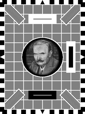 1930 hatte man leider weder PC, noch CD-Player zur Hand, und behalf sich logischerweise mit gezeichneten Testbildern, die einfach abgefilmt wurden. Die BBC hatte die Testbilder zusammen mit typischen Zwischentiteln auf eine Trommel geklebt, die zur passenden Gelegenheit vor die Kamera gedreht werden konnte: